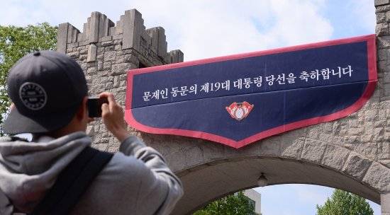대학 정문에는 문 대통령의 당선을 축하하는 현수막이 걸렸다.