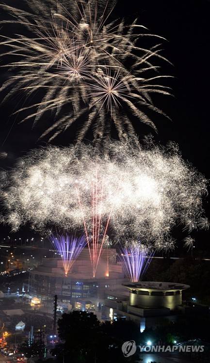 (의정부=연합뉴스) 김도윤 기자 = 제16회 의정부음악극축제 개막식이 13일 의정부예술의전당 야외무대에서 열렸다. 불꽃 쇼로 축제 분위기를 고조시키고 있다. 2017.5.13