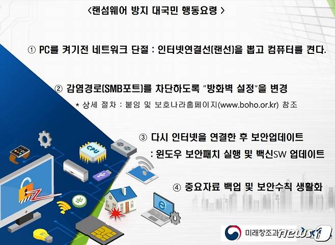 대규모 랜섬웨어 공격이 전세계를 강타한 가운데, 국내에 피해확산을 막기 위해 정부가 대국민 행동요령을 발표했다.