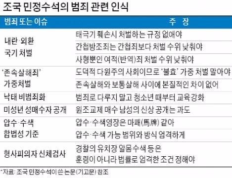 한국경제신문이 조 수석의 논문, 기고문 등을 분석한 결과 그의 범죄와 처벌에 대한 생각은 일반인들과 적잖은 차이가 있는 것으로 나타났다.