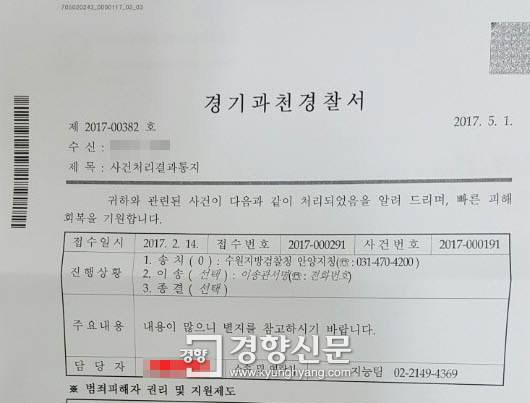 14일 과천경찰서는 피고발인 조사 없이 각하결정을 내릴 수 있느냐는 경향신문의 질의에 대해 “경찰은 고발내용이 명백히 죄가 되지 않는다고 판단하면 각하결정을 내릴 수 있다”고 밝혔다. 과천경찰서는 또 “피고발인들 상대로 조서를 작성하지는 않았으나 조사는 진행했다”고 덧붙였다.