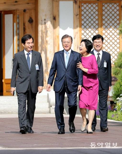 | 사진=문재인 대통령(왼쪽 두 번째)이 15일 거처를 청와대로 옮긴 이후 처음으로 여민관 집무실에 출근하기 위해 부인 김정숙 여사(오른쪽 두 번째)의 배웅을 받으며 주영훈 경호실장(왼쪽 첫 번째), 송인배 전 더불어민주당 일정총괄팀장(오른쪽 첫 번째) 등과 함께 관저에서 나오고 있다. 청와대사진기자단 |