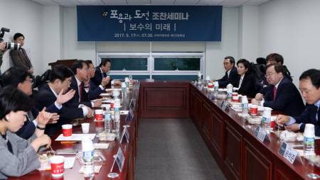 하지만 당 안팎의 쇄신 목소리에도 내부 계파싸움은 계속되고 있다. 세미나 직후 오전 9시부터 시작한 자유한국당 중진의원 간담회에서는 친박·비박계 의원과 현 지도부가 서로 비방하며 대선 패배에 대한 책임을 성토했다.