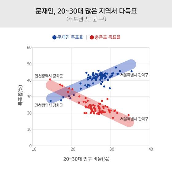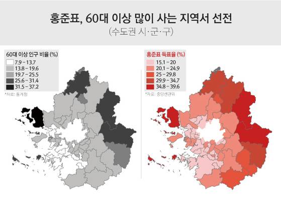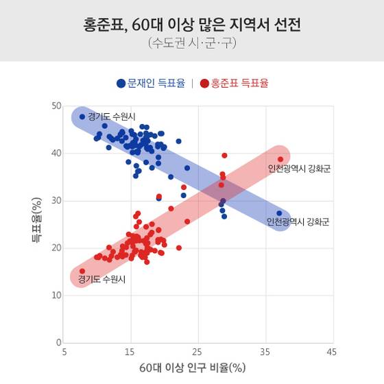 가령 60대 이상 인구 비율이 가장 높은 인천광역시 강화군(37%)에서 홍 전 지사는 39%의 표를 얻었다. 반면 문 대통령은 28% 득표에 그쳤다. 반대로 60대 이상 인구 비율이 가장 낮은 경기도 수원시(8%)에선 문 대통령은 48%, 홍 전 지사는 15%를 득표했다.