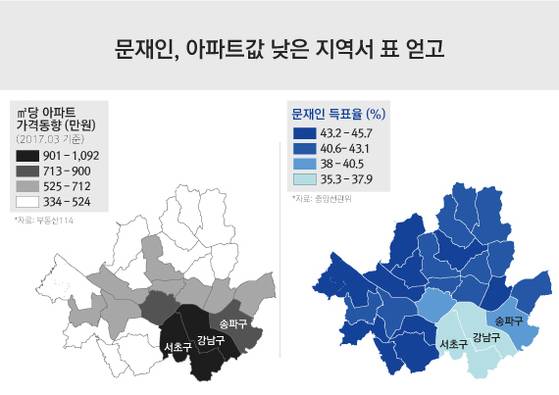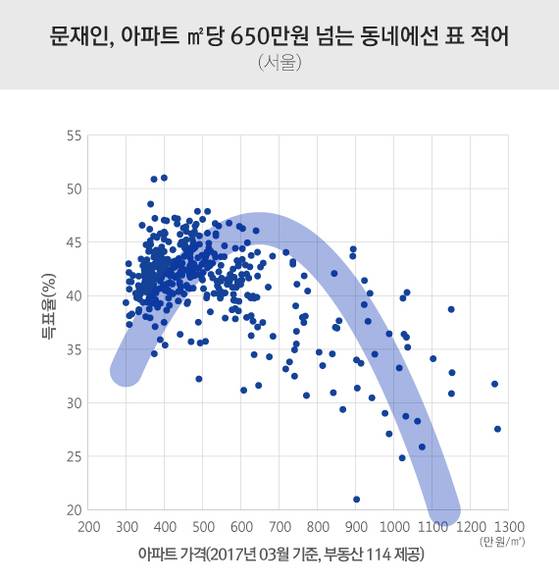 하지만 이번 대선에서 진보 후보였던 문 대통령의 득표율은 ㎡당 약 650만원을 기준으로 상반된 양상을 보였다. 아파트값 ㎡당 650만 원 이하 지역에선 상대적으로 아파트값이 비싼 지역으로 갈수록 득표율이 높았다. 반면 ㎡당 650만 원 이상 지역에서 아파트값이 비싼 곳으로 갈수록 오히려 득표율이 떨어졌다.