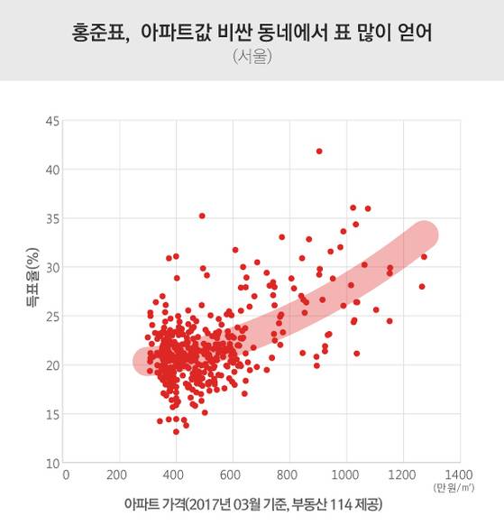 홍 전 지사의 경우는 반대였다. 전반적으로 아파트값이 비싼 지역에서 표를 더 많이 받았다. 하지만 예외 지역도 있었다. 1㎡당 아파트값이 300만~400만원이 지역에선 추세선 위쪽에 분포하는(평균값 이상의 득표율을 기록한) 곳이 꽤 있었다. 아파트값이 싼 지역에서 자신들의 경제적 이해 관계에 반해 홍 전 지사를 지지하는 ‘반(反) 계층 투표’가 이뤄진 셈이다.