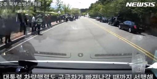 그 순간 119 구급차가 빨간색 비상등을 켜고 빠른 속도로 문 대통령이 탄 차와 경호 차량을 앞질렀다.