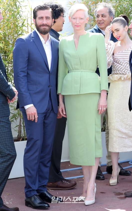 제 70회 칸 국제영화제(Cannes Film Festival) 경쟁부문에 초청된 영화 '옥자'의 배우 제이크 질렌할, 틸다 스윈튼이 19일 오전(현지시각) 프랑스 칸 뤼미에르 극장에서 열린 포토콜 행사에 참석하고 있다.