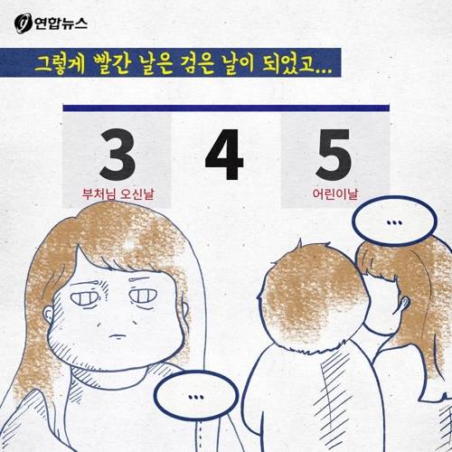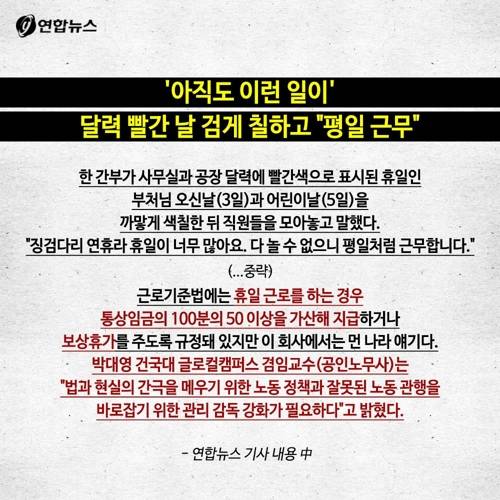 한 간부가 사무실과 공장 달력에 빨간색으로 표시된 휴일인 부처님 오신날(3일)과 어린이날(5일)을 까맣게 색칠한 뒤 직원들을 모아놓고 말했다. "징검다리 연휴라 휴일이 너무 많아요. 다 놀 수 없으니 평일처럼 근무합니다." (중략)