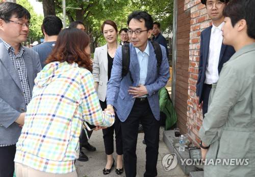 (서울=연합뉴스) 김주형 기자 = 하승창 청와대 사회혁신수석(가운데)이 20일 오후 서울 종로구 청운동사무소 앞에 있는 스텔라데이지호 농성장을 방문, 실종자 가족들을 만나고 있다. 2017.5.20