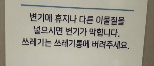 “변지에 휴지나 다른 이물질을 넣으시면 변기가 막힙니다. 휴지는 쓰레기통에 버려주세요.”