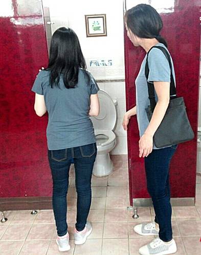 | 경찰관들이 강릉시 경포해변 화장실에서 몰래카메라가 설치되어 있는지 점검하고 있다. |