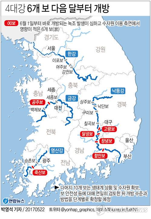 이번 지시에 따라 4대강에 있는 16개 보 가운데 녹조 발생이 심하고 수자원 이용 측면에서 영향이 적은 6개 보는 6월 1일부터 바로 개방된다.