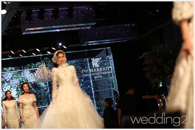메인 웨딩드레스 쇼가 펼쳐진 그랜드볼룸은 올해 새롭게 리뉴얼된 브라운 컬러의 버진 워크로 신부를 더욱 돋보이도록 만들었다. 여기에 유럽 명품 웨딩드레스 브랜드 ‘노비아’가 화려한 레이스 소재와 아름다운 자수로 뉴욕에서 인기를 끌고 있는 ‘로모자 케베자 라인’을 선보이며 고급스러우면서도 내추럴한 웨딩쇼를 더욱 풍성하게 만들었다.