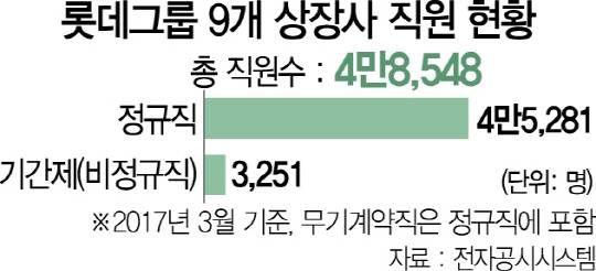 현재 롯데그룹 9개 상장사의 비정규직은 3,251명으로 전체(4만8,548명)의 6.7% 수준이다.