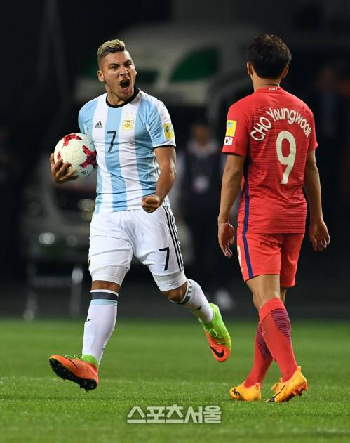 23일 전주월드컵경기장에서 열린 ‘FIFA U-20 월드컵 코리아 2017’ A조 한국과 아르헨티나의 조별 경기에서 아르헨티나의 마르셀로 토레스(왼쪽)가 만회골을 넣은 뒤 공을 들고 센터 서클을 향해 뛰어가고 있다. 2017. 5. 23.