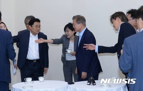 【서울=뉴시스】전진환 기자 = 25일 오전 첫 수석보좌관회의가 열린 청와대 여민관 소회의실에서 회의에 앞서 문재인 대통령에게 전병헌 정무수석, 조현옥 인사수석, 조국 민정수석이 커피가 있는곳을 안내하고 있다. 2017.05.25.