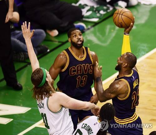 epa05990603 Cleveland Cavaliers forward LeBron James (R) takes a shot over defending Boston Celtics forward Jae Crowder (2-R) and Boston Celtics center Kelly Olynyk (L) of Canada as Cleveland Cavaliers center Tristan Thompson (2-L) of Canada looks on during the third quarter of the NBA Eastern Conference Final basketball game between the Cleveland Cavaliers and the Boston Celtics at the TD Garden in Boston, Massachusetts, USA, 25 May 2017. EPA/JOHN CETRINO