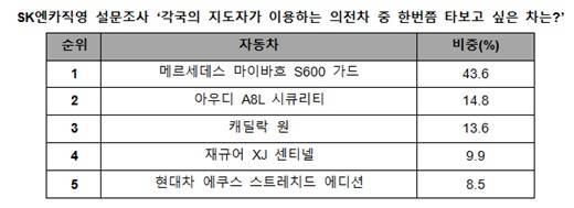 SK엔카직영이 성인남녀 413명을 대상으로 온라인 설문조사를 벌인 결과 조사에 참가한 43.6%가 ‘메르세데스 마이바흐 S600 가드’를 뽑았다.