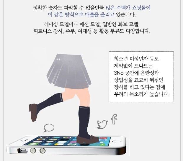 SNS에 넘쳐나는 일반 여성의 음란성 광고 게시물 뒤에는 십중팔구 쇼핑몰이 자리잡고 있습니다. 이 쇼핑몰만의 문제가 아닙니다. 정확한 숫자도 파악할 수 없을만큼 많은 수백개 쇼핑몰이 이 같은 방식으로 매출을 올리고 있습니다. 레이싱 모델이나 패션 모델, 일반인 화보 모델, 피트니스 강사, 주부, 여대생 등 활동 부류도 다양합니다.