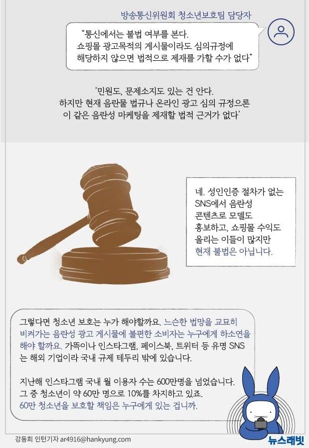 방송통신심의위원회 담당자는 "인스타그램 관련 광고성 음란물 민원이 계속 접수되고 있다"면서도 "음란물 심의 규정에 해당하지 않아 처벌하진 못한다"고 답합니다. 명확히 법적 음란물로 볼만큼의 수위는 아니란 뜻입니다. 그래서 음란물로 제재를 할 수는 없다는 거죠. 하지만 음란성 민원이 많기 때문에 계속 불법성 여부를 모니터링은 하고 있습니다.