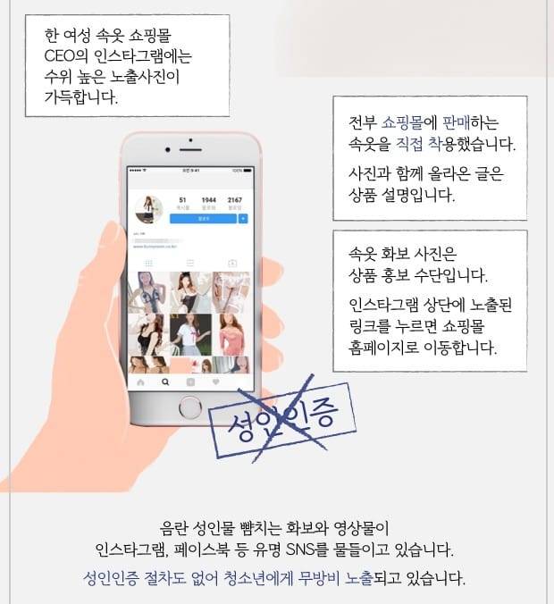 인스타그램에서부터 쇼핑몰까지 성인인증 절차는 없습니다. "미성년자들도 다 볼 수 있지 않냐"는 비난을 자주 받습니다. 그러나 해당 여성 CEO는 당당합니다. “성인인증이 된 계정에만 게시글을 공개하고 싶어도 적합한 기능이 없다. 그렇다고 이 매력적인 마케팅 플랫폼을 포기할 생각은 없다”고 댓글로 반박했죠. 문제가 있다는 건 알지만, 돈을 벌어야하니 그만둘 순 없다는 뜻입니다.