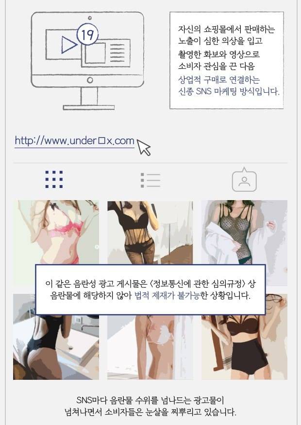 SNS마다 음란물 수위를 넘나드는 광고물이 넘쳐나면서 소비자들은 눈살을 찌뿌리고 있습니다. 하지만 ‘정보통신에 관한 심의규정’ 상 음란물에 해당하지 않아 법적 제재는 불가능한 상황입니다.