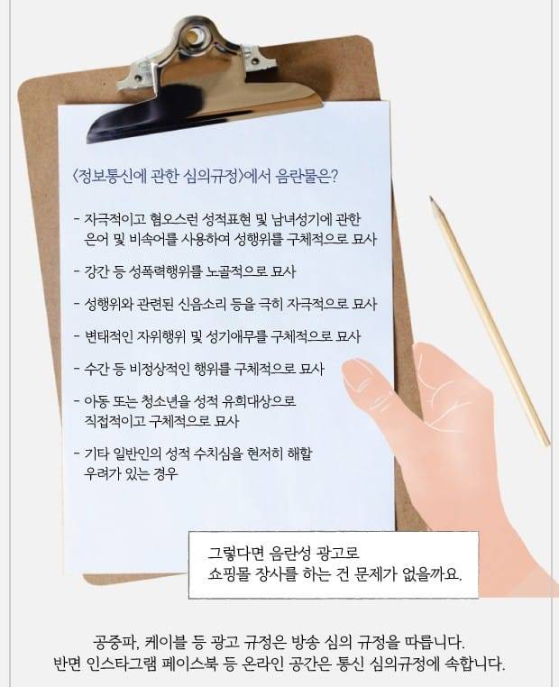 공중파, 케이블 등 광고 규정은 방송 심의 규정을 따릅니다. 반면 인스타그램 페이스북 등 온라인 공간은 통신 심의규정에 속합니다. 방송통신위원회 청소년보호팀 담당자는 "통신 상 불법 여부를 따진다"며 "쇼핑몰 광고목적의 게시물이라도 심의규정에 해당하지 않으면 법적으로 제재를 가할 수가 없다"고 말합니다. 상업적 온라인 쇼핑몰은 독립 심의규정이 없어 일반게시물 관리 조건과 동일하기 때문입니다.