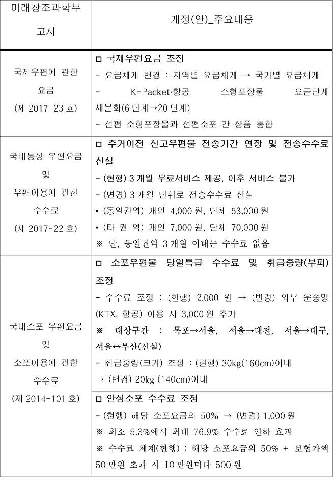 미래창조과학부 우정사업본부(본부장 김기덕)는 「국제우편에 관한 요금」, 「국내통상 우편요금 및 우편이용에 관한 수수료」, 「국내소포 우편요금 및 소포이용에 관한 수수료」 고시 개정(안)을 5월30일 행정예고하고 6월19일까지 의견을 수렴한다.
