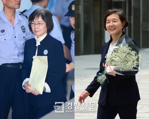최경희 전 이화여대 총장이 31일 서울중앙지방법원에서 열린 정유라 특혜 입학 의혹 관련 재판에 출석하기 위해 호송차에서 내리고 있다. (사진 왼쪽)