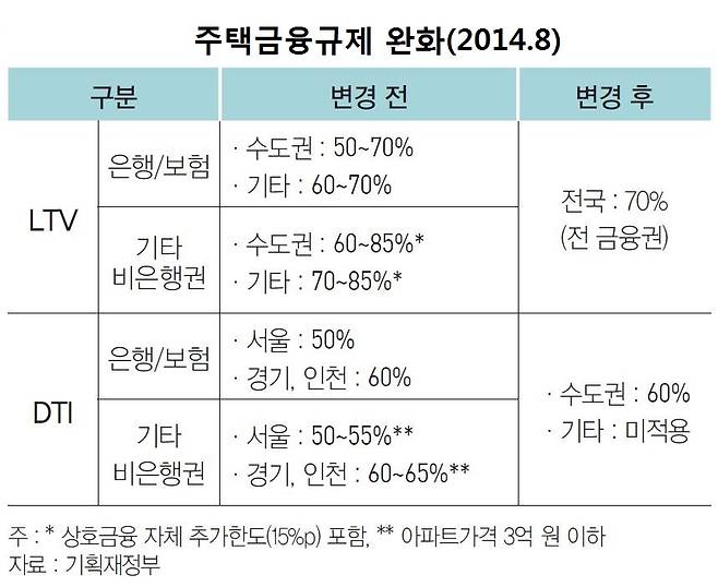 2010년부터 다시 주택시장이 침체되자 정부는 단계적으로 LTV·DTI 규제를 완화했다. 그러다 2011년 잠시 DTI 규제가 부활됐다. 2012년 5월 LTV·DTI 규제가 느슨해진 뒤 최경환 경제팀은 2014년 8월부터 LTV 70%, DTI 60%로 완화했다. 노문현 정부의 주택담보대출 규제 ‘대못’을 빼버린 셈이다.