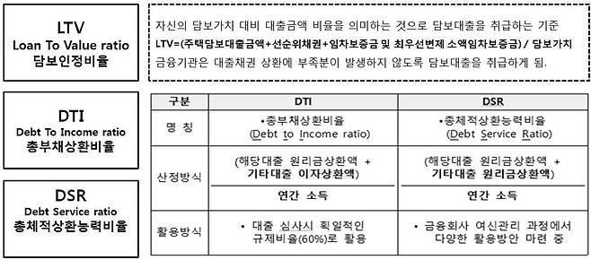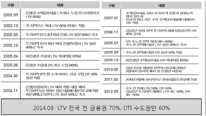 노무현 정부는 2005년 6월 비은행권으로 LTV를 확대한 데 이어 그해 8월에 DTI를 처음으로 도입했다. 앞서 2003년 10·29대책 때 추가대책으로 ‘차주의 상환능력에 입각한 보다 강화된 주택담보대출 취급기준 마련 유도’가 포함되면서 이후 DTI 도입의 씨앗은 뿌려졌었다. 노무현 정부의 DTI는 2007년 1월 기존 소유 주택담보대출로도 확대됐다. 주택대출 규제는 2008년 금융위기 이후에도 이어졌다. 금융위기 이후 가라앉은 주택시장이 2009년 ‘반짝’ 상승세를 보이며 대출이 늘어나자 당시 이명박 정부는 비은행권 주택담보대출에도 DTI를 적용키로 했다.