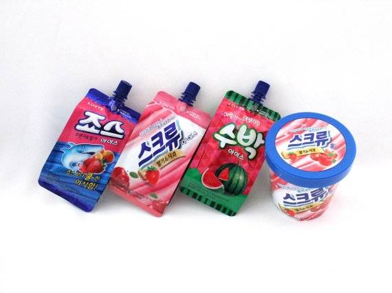| 롯데제과의 '죠스바-스크류바-수박바' 파우치와 스크류바 파인트컵 제품 |