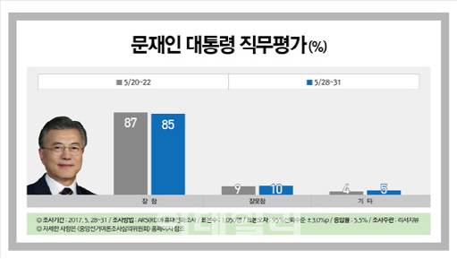 2일 여론조사전문기관 리서치뷰(대표 안일원)가 발표한 5월말 정기조사 결과에 다르면, 문대통령 직무수행에 대한 평가는 '잘함' 85%, '잘못함' 10%로 각각 나타났다.