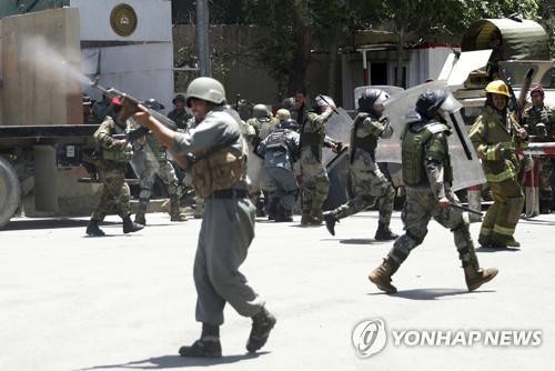 Police forces run as protesters throw stones in Kabul, Afghanistan, Friday, Jun 2, 2017. Some 500 people are demonstrating in Kabul for better security in the Afghan capital in the wake of a powerful truck bomb attack that killed 90 people. (AP Photos/Massoud Hossaini)