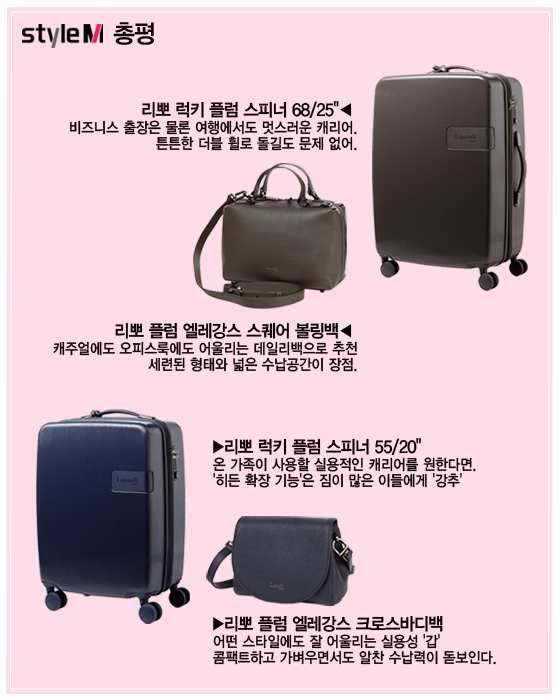 스타일M 기자 두명은 디자인은 물론 실용성을 겸비한 '리뽀'의 캐리어와 여행시 보조 가방으로 사용할 수 있는 핸드백을 사용해 봤다. 리뽀 'LUCKY PLUME(럭키 플럼) 러기지 백' 캐리어와 'PLUME ELEGANCE'(플럼 엘레강스)의 '크로스 바디 백' '스퀘어 볼링 백'을 각각 여행에 들고 가 본 후기를 소개한다.