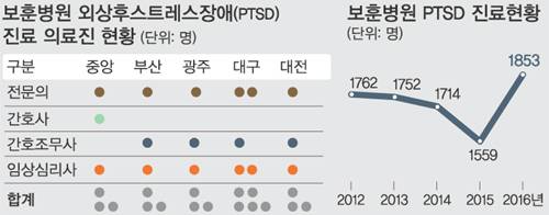 그러나 우리나라에서 PTSD가 질병으로 인정받게 된 것은 2003년 대구 지하철 참사 이후부터였다. 이전에는 PTSD 증상을 보여도 제대로 된 치료는커녕 ‘정신력이 약한 사람’으로 치부되기 일쑤였다. 지금도 미흡하다. 전국 5개 보훈병원에 PTSD를 관리하는 전문의는 모두 합쳐 6명에 불과하고 간호사를 포함한 전체 의료진 수는 17명이다. PTSD 증상을 보이는 환자와 원인에 대한 자료도 극히 드물다. 베트남 참전용사의 경우 28만8737명 중 15%인 4만3000여명이 지금까지 PTSD 고통을 겪고 있는 것으로 알려졌다.