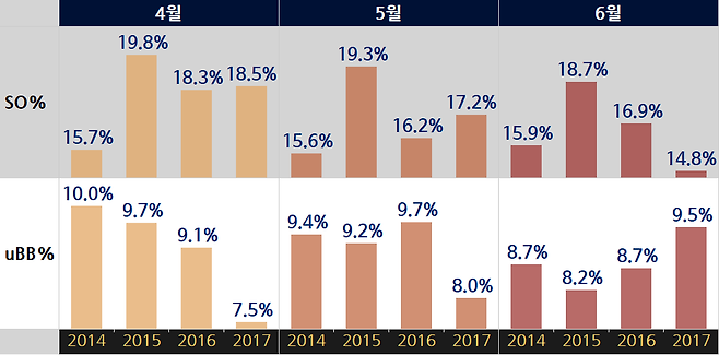 이는 시즌 초의 득점하락이 스트라이크존 조정과 관계있음을 시사한다. 그런데 6월 들어서 타석당 삼진비율은 14.8%로 지난 4시즌 중 가장 적었고 타석당 볼넷비율은 9.5%로 가장 높았다. 역대급 타고였던 14-16년에 비해 삼진은 더 적고, 볼넷은 더 많은 것이다.