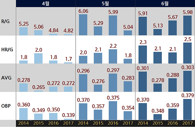 그런데 최근 들어 조짐이 묘하다. 지난 주말 3연전의 경기당 득점은 5.8점이다. 15경기에서 35개의 홈런이 터졌다. 물론 일시적 현상일 수 있다. 하지만 몇 년 동안의 월별 통계를 보면 괜한 의심이 아니라는 생각도 해봐야 한다. 시즌 초의 득점저하 경향이 애당초 착시였을 가능성이 있기 때문이다.