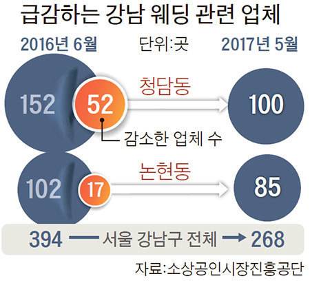 지난달 30일에는 청담동에서 결혼컨설팅 업체를 운영하던 대표 A씨(40)가 자살을 시도했다. A씨 주변인들에 따르면 그는 사업 악화로 스트레스에 시달리다 유서를 남기고 약물을 과다 복용했다. 일찍 발견돼 병원으로 옮겨져 생명을 잃지 않았다. 한때 ‘웨딩의 메카’라 불려온 서울 강남의 웨딩산업이 흔들리고 있다. 소상공인시장진흥공단에 따르면 지난해 6월 394곳이던 강남구의 예식장과 웨딩컨설팅 회사 등 예식 서비스 업체는 현재 268곳으로 줄었다. 1년 새 31.9%가 문을 닫았다. 비혼이나 만혼의 풍조가 짙어진 게 1차 원인이다. 통계청 조사 결과 2006년엔 33만 쌍이 결혼했지만 지난해엔 28만1600쌍으로 감소했다. 결혼정보회사 ‘듀오’의 집계에 따르면 남녀의 평균 결혼 연령도 각각 35.8세와 32.7세로 10년 전에 비해 2.4년 높아졌다.