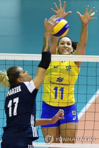 epa06013541 Poland's Malwina Smarzek (L) in action against Brazil's Tandara Caixeta (R) during the game between Brazil and Poland at the Montreux Volleyball Masters women's tournament in Montreux, Switzerland, 06 June 2017. EPA/LAURENT GILLIERON