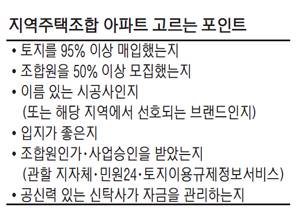 사업면적 95% 이상의 토지를 확보했는지도 반드시 살펴봐야 한다. 지역주택조합 사업이 표류하는 경우 대부분은 토지매입이 원활하지 못할 때다. 95% 토지를 확보하고 나면 주택법에 따라 더 이상 '알박기'가 불가능하기 때문에 차질 없이 사업을 진행할 수 있게 된다. 권강수 한국창업부동산정보원 이사는 "지역주택조합 아파트는 장점도 많지만 고려해야 할 사항도 많다"며 "사업용지 확보가 95% 이상인지, 공신력 있는 신탁사가 자금을 관리하는지, 믿을 수 있는 시공사인지 등을 꼼꼼히 따져봐야 한다"고 말했다.