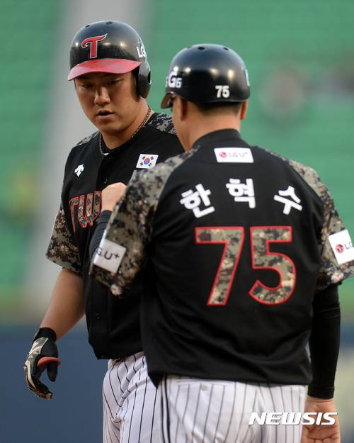 【서울=뉴시스】고범준 기자 = 9일 오후 서울 송파구 잠실야구장에서 열린 2017 KBO리그 LG 트윈스와 SK 와이번스의 경기, 2회말 2사 주자없는 상황 LG 조윤준이 우익수 왼쪽 1루타를 치고 한혁수 코치와 하이파이브 하고 있다. 2017.06.09.