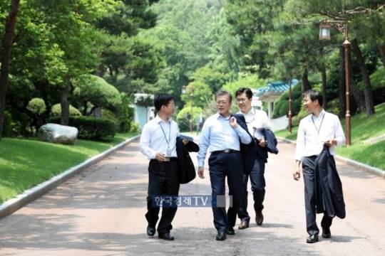 문 대통령은 식사를 마친 뒤 여민관 사무실 곳곳을 들러 직원들과 인사를 나눈 뒤 직원 몇몇과 청와대 뒷산 길을 1시간 여 산책을 했습니다.