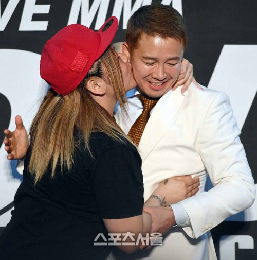경기후 열린 종합 기자회견에서 일본선수 요시코가 정문홍 로드FC 대표에게 키스를 퍼붓고 있다.