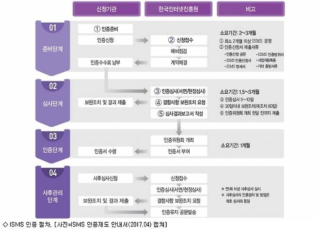 ISMS는 미래창조과학부가 관리하고 한국인터넷진흥원(KISA)과 금융보안원(PSI) 등이 인증기관으로 있는 정보보호 인증 제도다. 미래부는 정보통신망법 제47조 2항에 근거해 정보 보호가 중요시되는 정보통신서비스제공자를 대상으로 일정 기준에 따라 ISMS 인증을 의무화하고 있다.