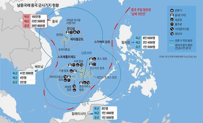 이곳에는 현재 40㎜ 고사포와 120㎜ 박격포, AT4 대전차로켓 등이 배치돼 있는 상태다. 지난해 9월엔 미사일 방어체계로 추정되는 방공타워 건설 장면도 포착됐다. 필리핀은 자국이 실효 지배하고 있는 스프래틀리제도의 파그아사섬에 4억 5000만 페소(약 107억원)를 들여 새 항구를 건설할 계획이다. 베트남 역시 자국이 점거한 스프래틀리제도의 콴다오쯔엉사(南?島)에서 활주로를 1219m로 확장하는 한편 2개의 대형 격납고를 건설해 해양정찰기와 수송기까지 이용할 수 있도록 대규모 공사를 벌이고 있다.