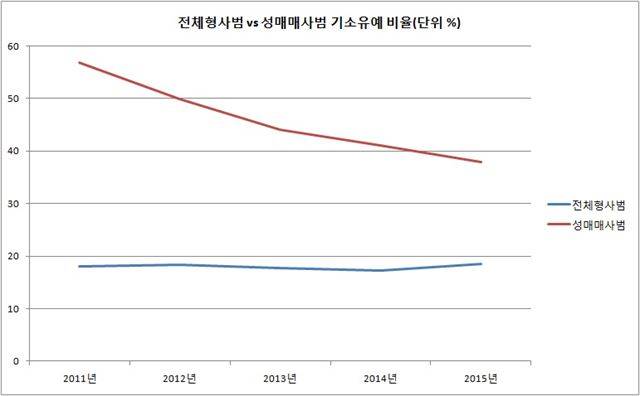 그런데 이는 전체 형사범에 대한 기소유예 처분과 비교해보면 상당한 수준이다. 지난 5년간 전체 형사범의 기소유예 처분 비율은 평균 17.9%에 머물렀기 때문이다. 성매매사범에 대한 선처 비율이 다른 형사범죄에 비해 약 2.5배 높았던 셈이다.
