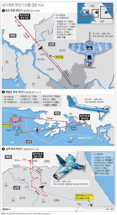 2014년 3∼4월 파주, 삼척, 백령도 등에서 발견된 북한 무인기 3대는 수도권과 서북도서 등 상대적으로 군사분계선(MDL)과 가까운 지역 상공을 비행한 것으로 파악됐다.