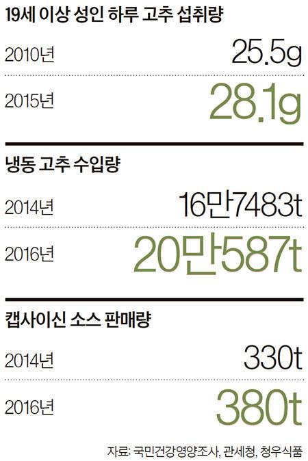 요즘 외식업과 식품업계는 매운맛 경쟁이 치열하다. 식당에서 파는 음식뿐 아니라 치킨·라면·만두·햄버거·도넛 등 다양한 종류의 매운맛 신제품이 쏟아진다. 13일 관세청에 따르면 매운맛의 대표 격인 냉동 고추 수입량은 2014년 16만7483t에서 지난해 20만587t으로 약 20% 늘었다. 국내 캡사이신 농축소스 판매량은 2014년 330t에서 2016년 380t으로 15%가량 증가했다(청우식품 집계).